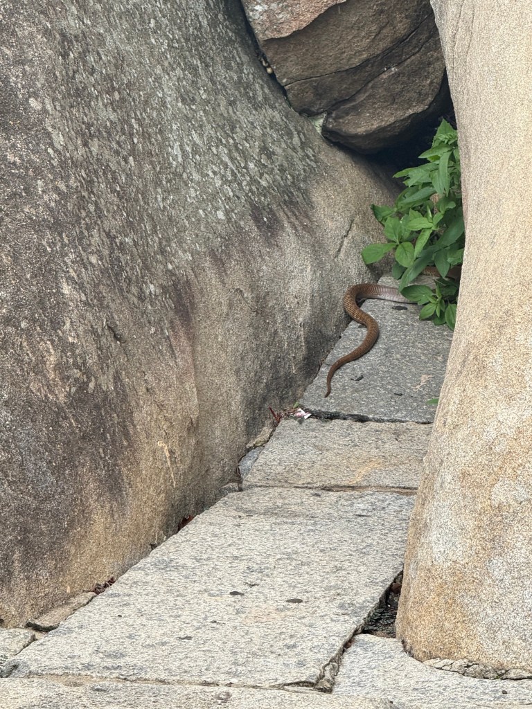 The Gomateshwara statue hill is in center of the town and needs quite a bit of driving into the town. Another destination where the clothing restrictions are heavily enforced- check details before you plan to climb the hill. It was hot since it was almost noon and there was no shade, so some of us decided to climb the hill by stairs while others stayed back. But once we were on top of the hill , it is quiet and peaceful. We spent a long time just enjoying the quietness and the view from top of the hill. On our way down we even caught the tail of a snake which google lens said it is king cobra(if you think it isn’t leave a comment). This stop offers a slower, contemplative pause before the final drive back to Bengaluru. On our way back it was raining endlessly and it felt like a icky long drive home.
